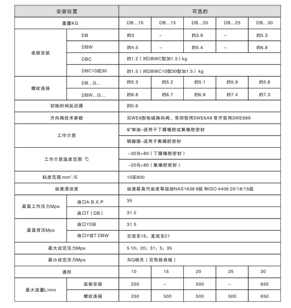 用于底板安裝,安裝面按DIN24340 E型,ISO 6264和CETOP-RP 121 H,用于螺紋連接,用于油路塊安裝。4種調整元件:①旋鈕②帶護罩的調節螺栓③帶刻度的有鎖旋鈕④帶刻度旋鈕。5種設定壓力,借助于安裝在其上的電磁方向閥操作卸荷??蛇x的切換時間延遲(僅DBW型)。