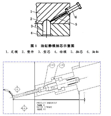 定模抽芯用油缸驅動,大大簡化模具結構,降低成本;但需注意動作順序的控制和滑塊鎖緊,以免動作錯亂損壞模具或油缸鎖緊力不足而無法封膠,抽芯力不足而抽不動滑塊。