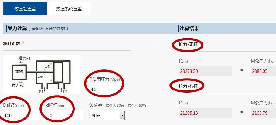 (P:壓強; S:受壓面積—由油缸的缸徑、桿徑?jīng)Q定)