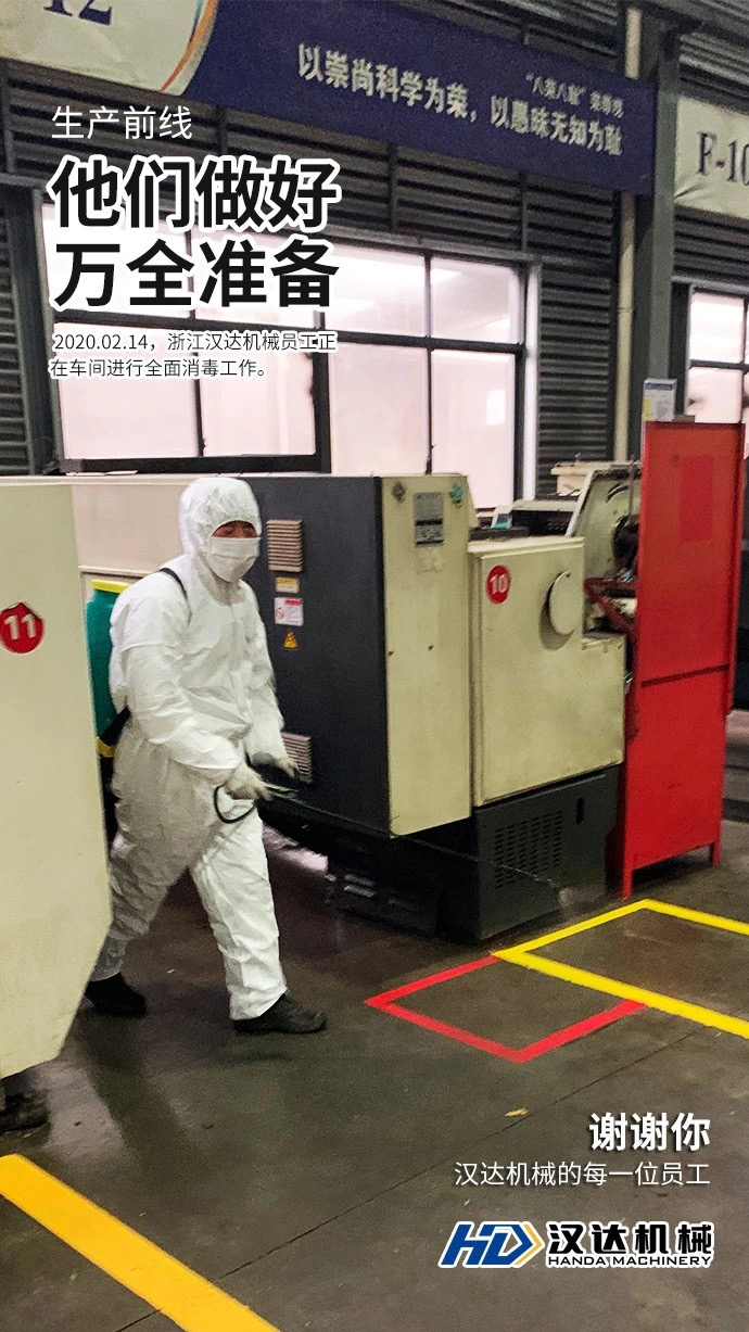依據批復文件,浙江漢達機械于2月14日開始逐步復工,分批次上班。各員工先在家自我測量體溫,低于37.2度的返回公司,溫度自查合格員工戴口罩到公司后,依次測量體溫,領口罩,填寫承諾書領取健康證后上崗。
