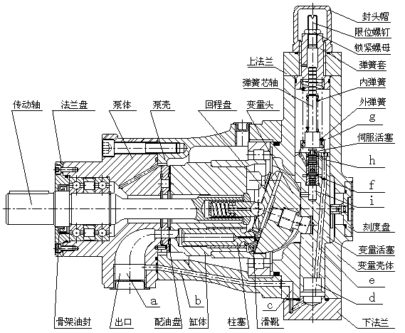 軸向柱塞泵是采用配油盤配油,缸體旋轉,靠變量頭變量的斜盤式軸向柱塞泵。該泵采用液壓靜力平衡的最佳油膜厚度設計,使缸體與配油盤、滑靴與變量頭之間處于純液體摩擦下運轉,具有結構簡單、體積小、噪音低、效率高、壽命長和有自吸能力等優點。